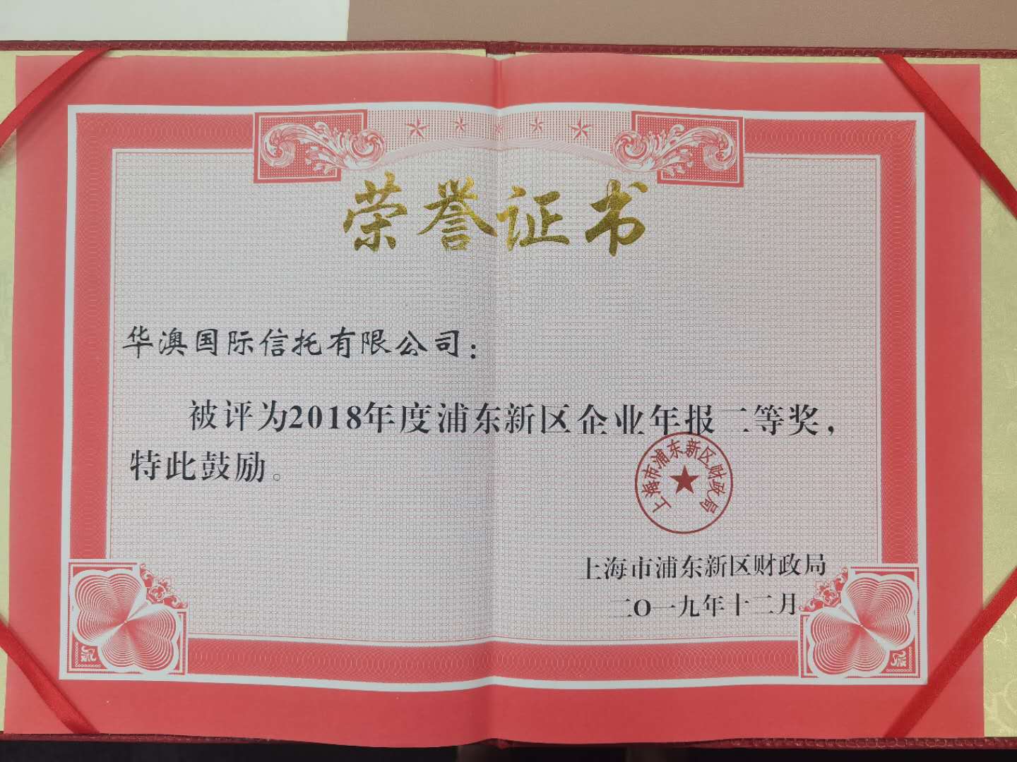 2019年12月,公司荣获由上海市浦东新区财政局颁发的荣誉证书,公司在2018年度浦东新区企业年报工作中被评为二等奖。