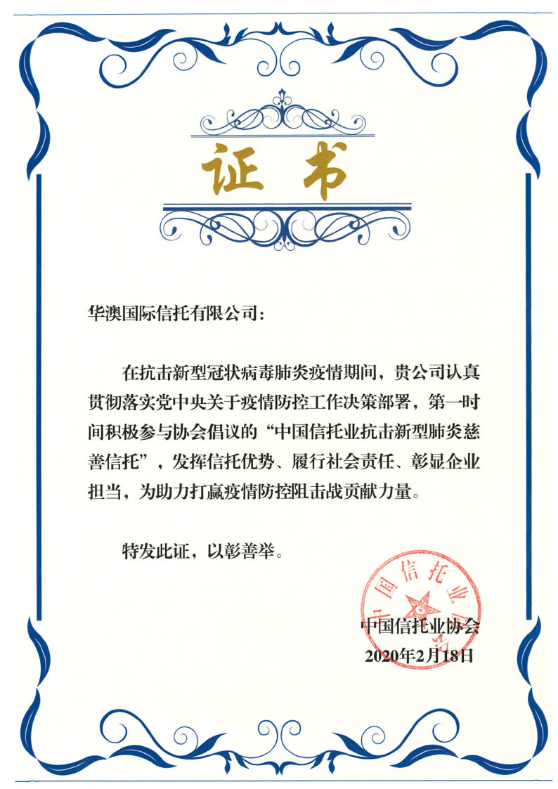 近日,公司荣获由中国信托业协会颁发的荣誉证书,协会对公司在抗击新冠病毒疫情期间作出的社会贡献给予了肯定。